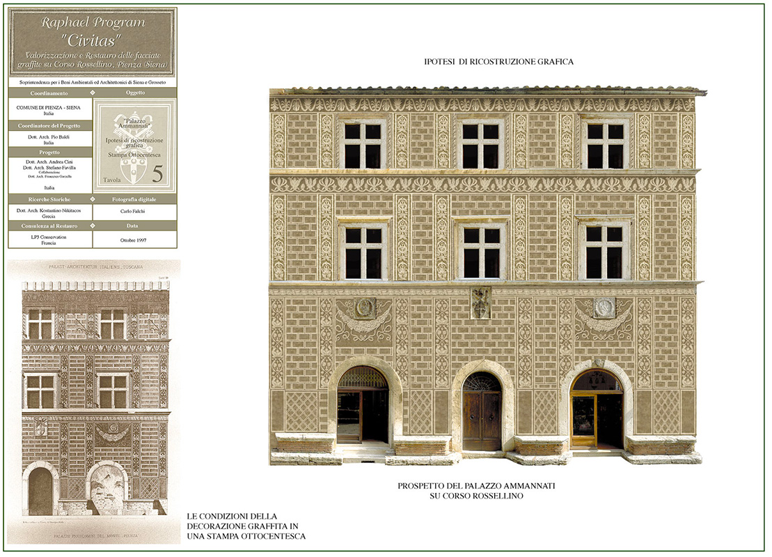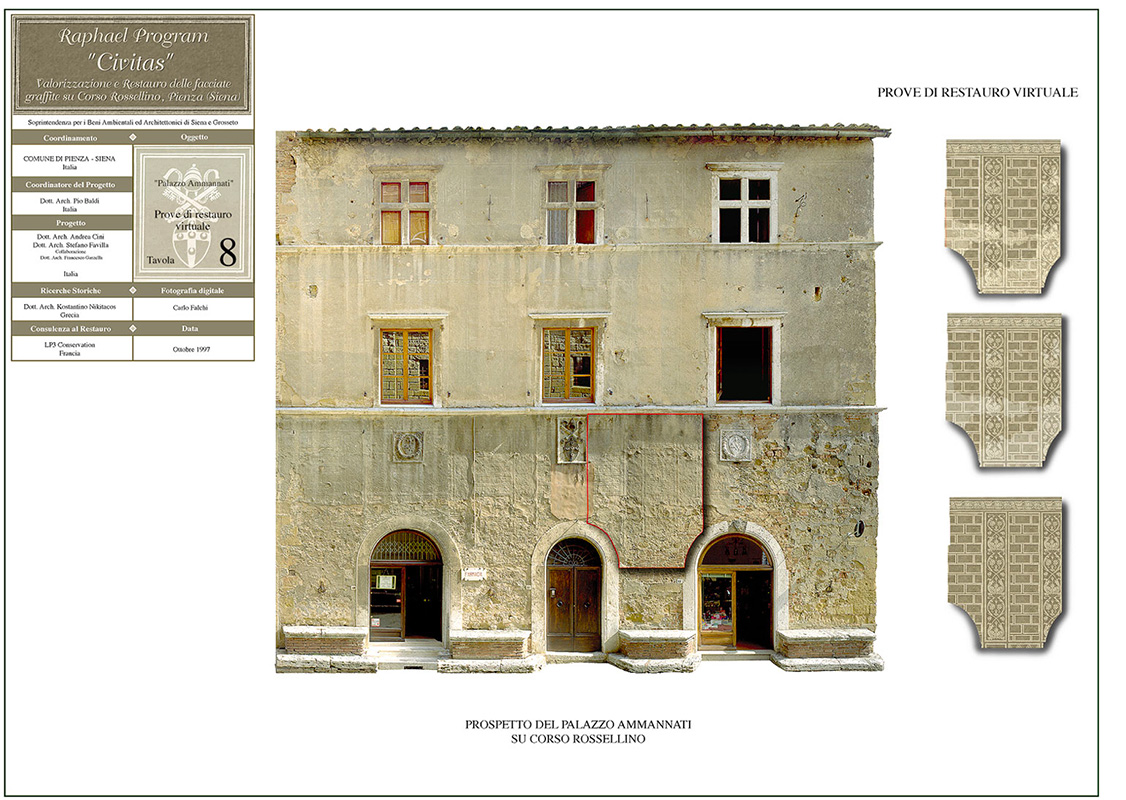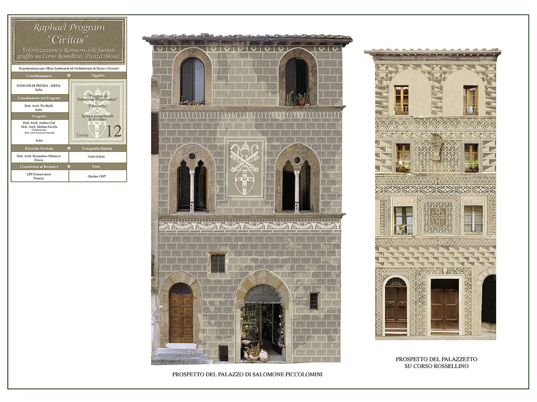 Il progetto, in collaborazione con la Soprintendenza per i Beni Ambientali ed Architettonici di Siena e Grosseto e il Comune di Pienza (SI), ha previsto il rilievo dei palazzi storici con facciata graffita, tramite ortofoto e laserscanner, sul corso Rossellino della città di Pienza ai fini del restauro.